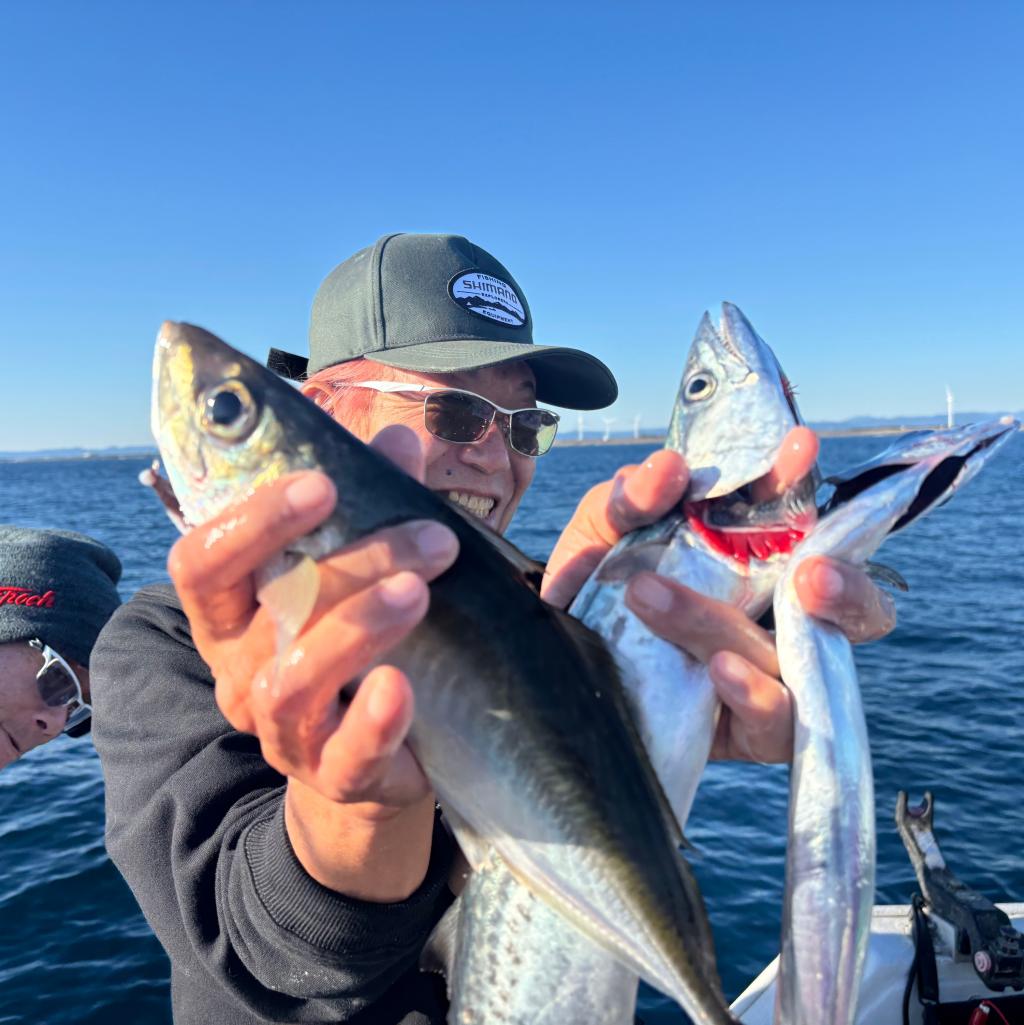 2025年12月29日釣果アジ釣り、タチウオ釣り 今日は、朝一は風が残る予報だったので、ゆっくり出船しました。太刀魚前にちょっとアジ釣りしてお土産は確保!!その後の太刀魚は、最初から入れ食いペース!が、時間が経つにつれてサイズダウン…(-。-;数は伸びたんだけど、サイズ的に不満が…(・・;)それでも充分良いサイズは釣れましたが(^^;;太刀魚の竿頭は40本ジャスト!!アジは12匹?遠方からお疲れ様でした!手巻きテンヤで20本超え!……。サゴシも入って五目!素直が一番!お祭り男!本日はお疲れ様でした!また来年も是非よろしくお願いします!差し入れ色々ありがとうございました♪♪